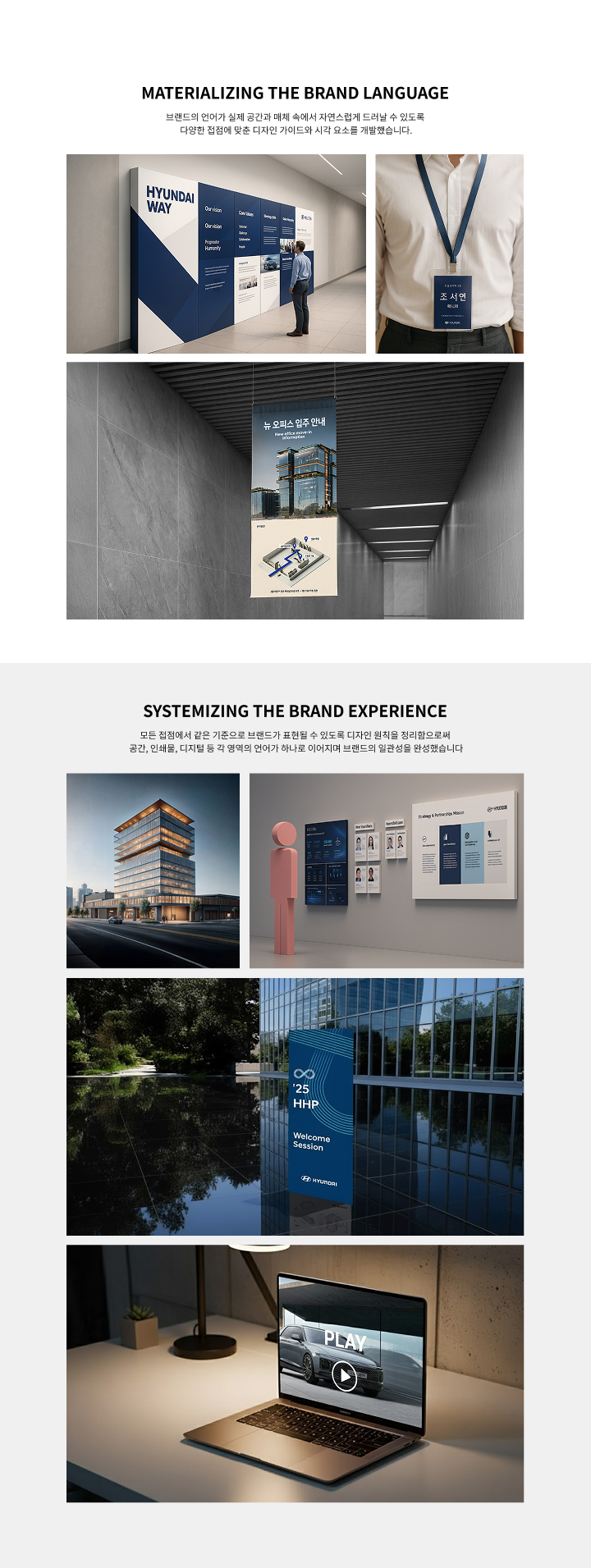 현대자동차의 사내 브랜드 운영은 브랜드 철학을 일상 속 경험으로 연결하는 과정이었습니다. 가이드라인을 단순히 적용하는 대신 현대자동차가 지향하는 가치가 자연스럽게 스며들 수 있는 방식을 고민했습니다.