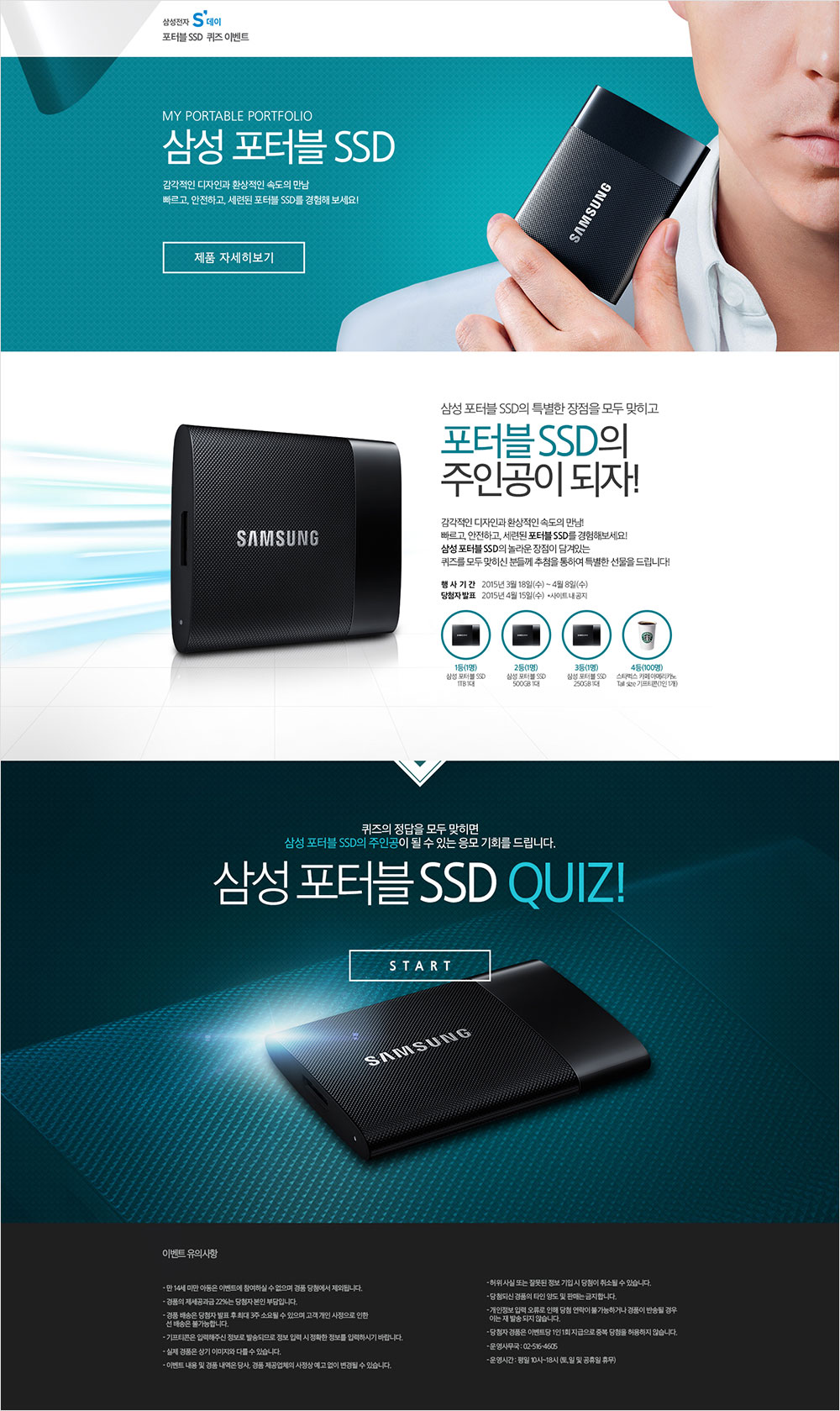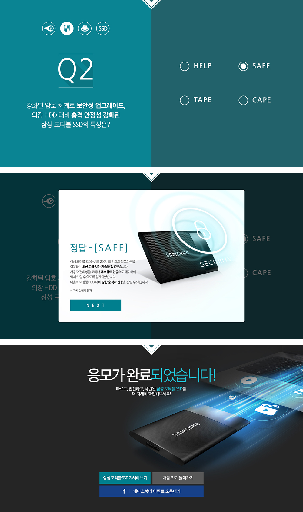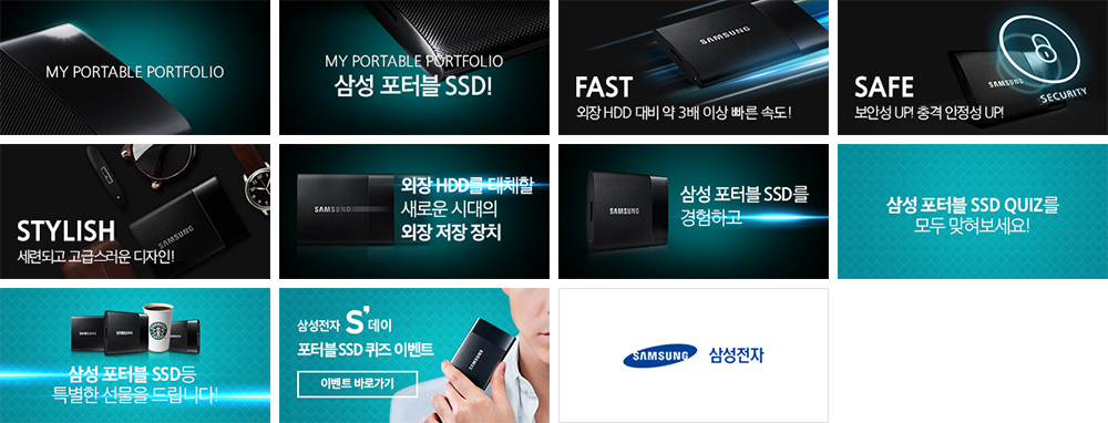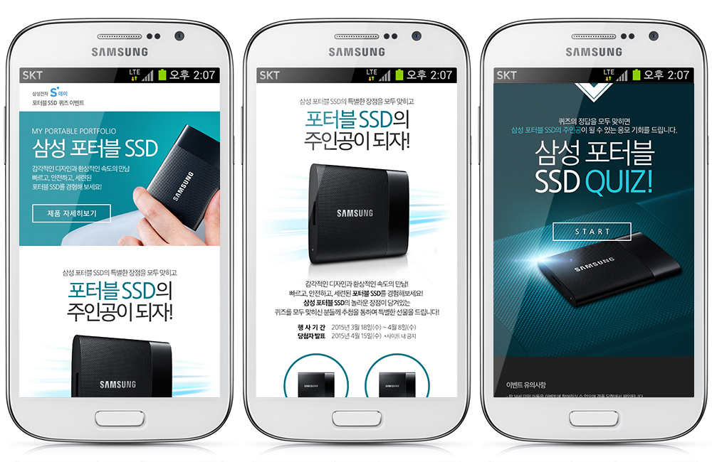 올해 초 삼성전자의 웹사이트가 반응형 웹으로 리뉴얼이 되었습니다. 이에 따라 이번 포터블 SSD 캠페인 페이지 역시 반응형 웹으로 제작하였습니다. 반응형 UI에 최적화된 디자인을 기본으로 심플하고 임팩트 있는 비주얼을 담아내기 위해 많은 고민을 하였고, 제품에 어울리는 컬러톤과 제품에 녹아있는 레이저 패터닝을 형상화하여 전체 디자인을 완성하였습니다. 또한 제품의 USP를 효과적으로 전달하기 위해 쉽고 재미있는 QUIZ를 기획하여 문제를 풀 때마다 제품의 특장점을 습득할 수 있게 하였고, 이를 공유할 수 있는 기능을 갖추어 이벤트가 더 확산될 수 있도록 하였습니다. 이렇게 쉽고 간결하게 이벤트를 참여하면서 자연스럽게 제품에 대한 궁금증을 유발시켜 3주간의 이벤트 동안 발생된 11만 건의 UV와 약 4만 건의 제품 자세히 보기 클릭 수를 기록하여 제품 관심도 증가에 긍정적 역할을 할 수 있었습니다.